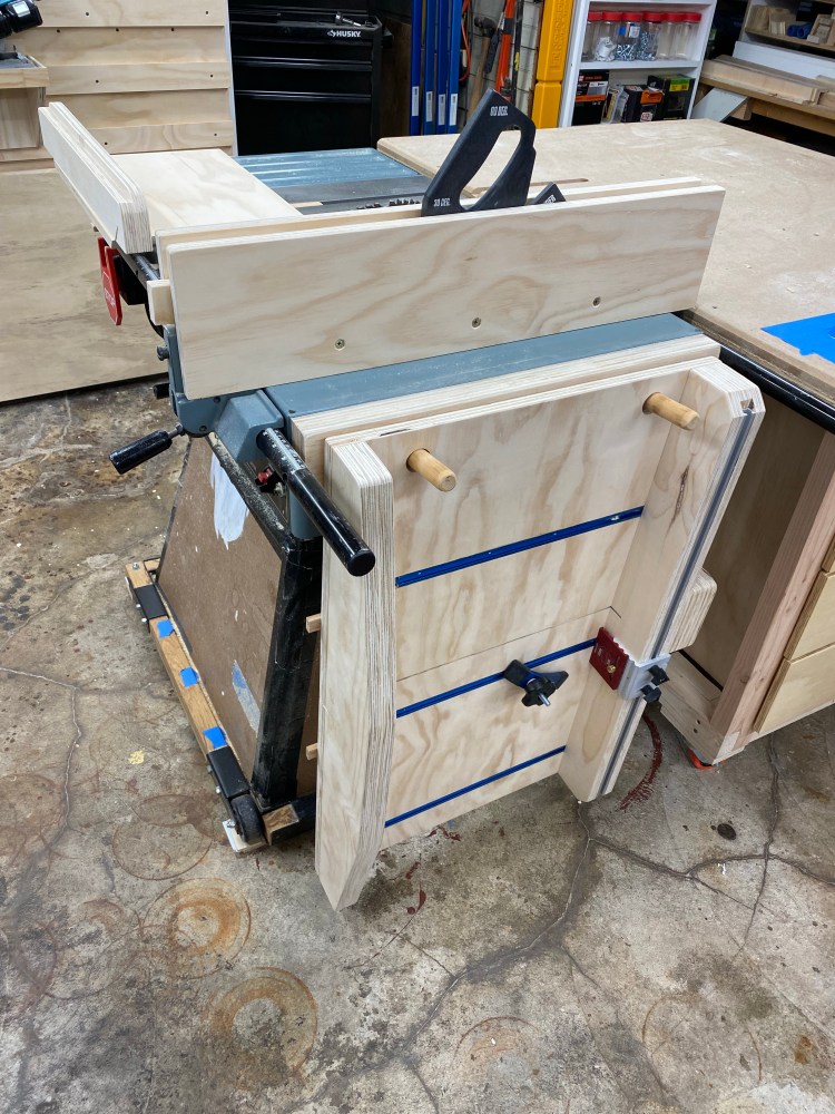 The ceilings in my shop are not very high and I considered a way to mount it above the table saw. In my mind, I could picture how to secure it. That said, I couldn’t really find a way to easily maneuver it over my head to put it away, or take it out, without possibly dropping it on the saw, or my head. So I crossed that option off. Hanging it on a wall seemed like the best option, but wall space is limited and what I had was not convenient to where I keep the saw. Another option I crossed off.