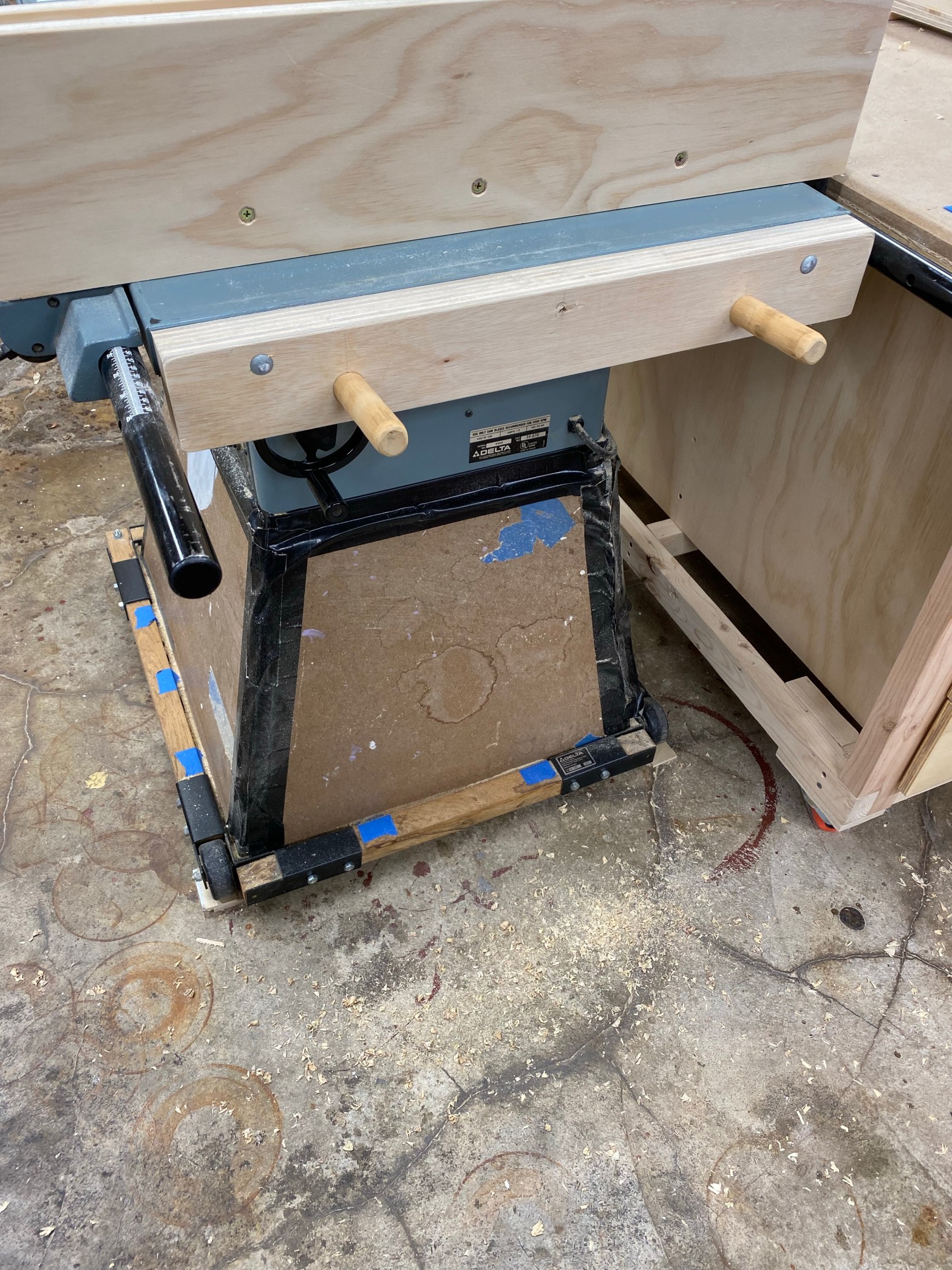 The ceilings in my shop are not very high and I considered a way to mount it above the table saw. In my mind, I could picture how to secure it. That said, I couldn’t really find a way to easily maneuver it over my head to put it away, or take it out, without possibly dropping it on the saw, or my head. So I crossed that option off. Hanging it on a wall seemed like the best option, but wall space is limited and what I had was not convenient to where I keep the saw. Another option I crossed off.