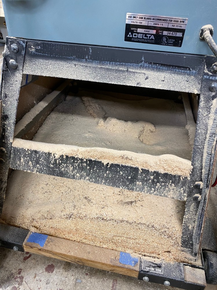 Lest you think I have given up, no, that would be too easy. I started all over again. Two more pieces of 12″ x 12″ baltic birch (only two more, better get some on sale at the Woodcraft before they run out) and some additional walnut. I changed how I cut the bevels on the table saw to see if I can get a more consistent cut, and without giving away the surprise of a future post, I have progressed beyond a new bin full of little squares. On a side note, when you are looking for a table saw, try and get one that allows you to remove the throat plate without tools or screws. You’re probably thinking, “that’s an odd tidbit to throw out there at this point” and you would be right. “Why do you bring this up now” you are wondering, well I can tell you. To try and improve the cut quality of my 90 degree cuts, I added a zero clearance insert to my saw, and in the process, I dropped one of the two screws inside the saw. Now I have a contractor style saw which is open on the bottom – except that I enclosed mine because the dust collection is so spectacularly awful. When I opened up the bottom to retrieve my lost screw, I found about 10 inches of sawdust piling up down there. Thankfully the screw was right on top, but while it was all open I cleaned it all out. Someday future me will get a saw that has no screws required to change a blade or a throat plate.