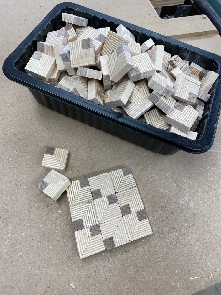 Once that was done, I was able to sand off any squeeze out that might get in the way and then I could break out the still nameless crosscut sled. I lined up the blanks against the back fence, set my JKMoses stop block (https://kmtools.com/products/the-katz-moses-universal-no-deflection-stop-block-version-2-0-1?variant=41043887161514) to about 3/8 of an inch and starting making little squares. I had made about 8 blanks, and each cut up into about 20 squares, so a quick 160 cuts or so later and I had a bin of squares, ready to be made in to a pattern. I hand sanded each of the edges to get rid of the fuzzies and allow them to glue up nice and tight.