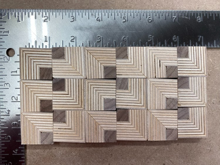 This was going more quickly now as the steps were familiar to me. I broke out the jig from the prototype, saving more time, and started getting ready to glue up a small panel. This is where the wheels came off my project. As I tried assembling the pieces, they simply didn’t fit properly together. When they were close, there were gaps between them, and the lines weren’t straight. I tried and tired to find enough pieces to go together cleanly but it just didn’t work. I was consistent, which is usually good, but in this case, I was consistently out of square on my blanks. The angles were not exactly 45 degrees, and that left me squares, that were not square. I could not, and still have not thought of any way to fix them. If I were to sand them or cut them in any way to get them to be square – with proper 90 degree corners all around, then the pattern in the plywood doesn’t work. Since they are glued at a bad angle, any adjustment to the sides to “square” them up just means the pattern of the plywood enhances the inaccuracy in the cuts even more. This was not acceptable. All I could think of is when someone on the Great British Baking Show burns something and decides to “bin it”. I held my tray of 160 odd shaped bits of baltic birch plywood and walnut over the bin (that’s the trash bin for you non British speakers) but could not bring myself to toss them. They now sit forlorn and dusty in the corner of the shop. No longer a project in the works, but also not in the scrap bin. They hover in purgatory, betwixt and between.