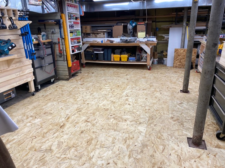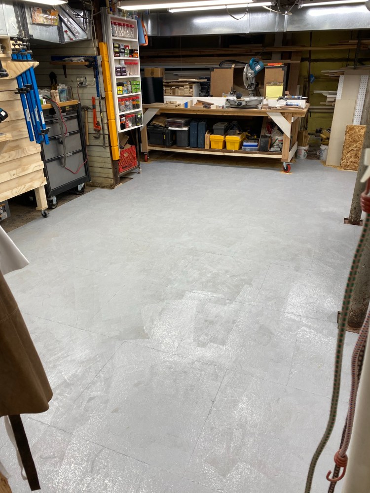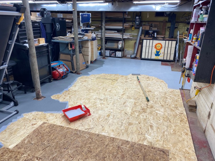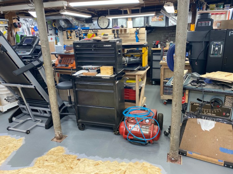 Eventually I got the majority of the flooring down – but I was not thrilled with the look of the OSB, especially when it was time to sweep up sawdust, so I decided to paint it grey. Once again, everything had to be moved. Clear out one half of the shop, and then get to painting. One coat of primer, two coats of floor paint, and now the OSB looks almost like cement, Kinda funny how that worked out. It just looks like a clean basement floor. So the last coat of paint went down this morning on the primary section of the basement. There are some small parts I will need to come back to, but they are not where the tools are, so I can do them another time. Given all the moves back and forth, I am very impressed with the ICS mobile base on the SawStop (I have a PCS saw, ICS base) – it works great. For a 450 pound saw, it is comically easy to move around in the shop, yet is completely stable otherwise.