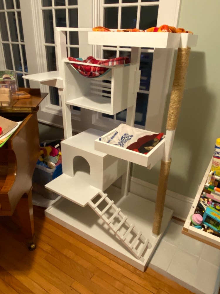 The cat tree was designed to sit in front of a group of windows, so the cats can stare outside at the birds when they are not sleeping. There are scratching posts built in (I have never seen them used) as well as multiple levels and even an enclosed space for them to hide in. I even tried to make one area out of cloth so it would work like a hammock of sorts, but they don’t use that part.