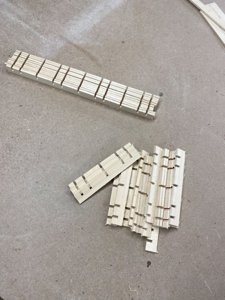 I purchased a nice big piece of basswood from a local lumberyard, so that I would have something to make the strips with. They needed a bit of thicknessing (which generally means making them less thick) on the planer. Next time, I think I should plane them down even more, but these still worked out. When I started this project, I was still using my old saw and was not comfortable with trying to cut accurate strips, so I cut them roughly to size (all oversized) on the bandsaw, which probably also gave me more strips from the board since the kerf is so much smaller on the bandsaw. Then to get them to the proper thickness (they need to be exactly the same thickness as the kerf of a sawblade), I drove out to my father’s shop with my handful of 18 inch strips of basswood.