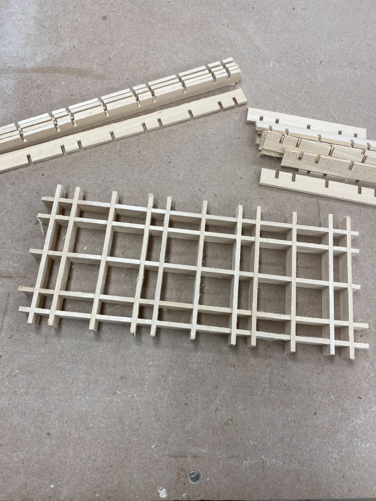 Now I had a pile of basswood strips that were the right thickness. Now I needed to make my own notches for the half laps to make the grid. For that I turned to the instructions in Matt Kenney’s “The Basics of Kumiko” book, which I highly recommend if you are interested in trying this https://mek-woodworks.myshopify.com/collections/for-your-shop/products/the-art-of-kumiko-signed-softcover?variant=32569101058148. He explained how to make a sled for the tablesaw that would allow for you to make many different patterns, and to a bigger or smaller scale with the same sled. It works like a box joint jig with an indexing pin, but it adds another layer where you can reference a second element off the first indexing pin to make a gap an exact multiple of the original – and allowing you to size you grid for the patter you wish to make. The first strip I made, I did wrong – but that also helped me get my head around what was supposed to happen, and I was able to make the rest without additional mistakes. The pattern is a mix of an outer grid that stays “empty” and three inner sections that will later be filled in with the little handcut pieces to make the asanoha pattern side by side by side. I made enough parts to make two of these. If it is worth making, it is probably worth making two, right?
