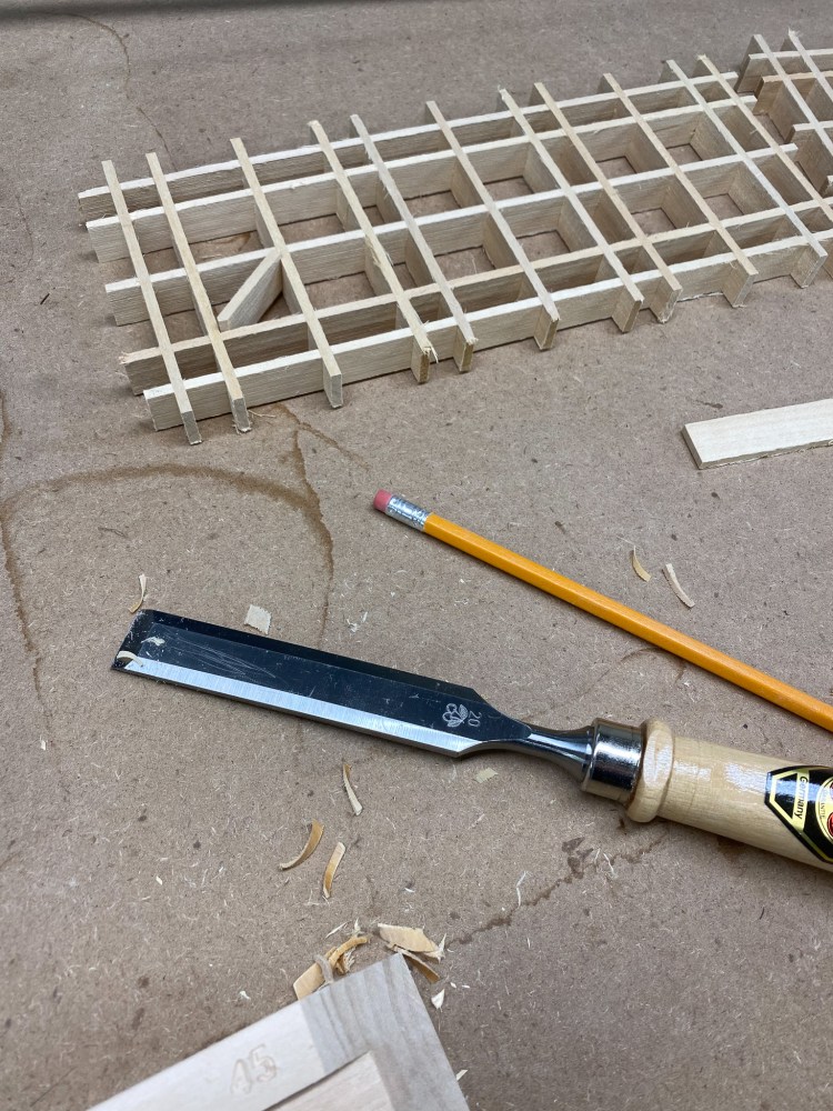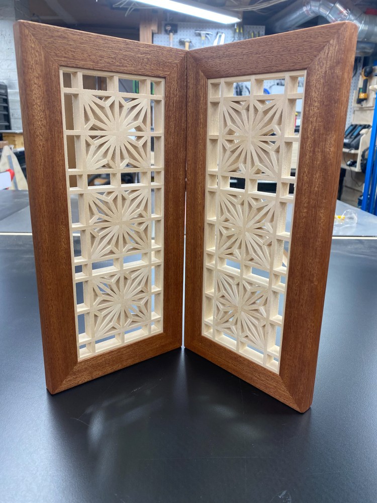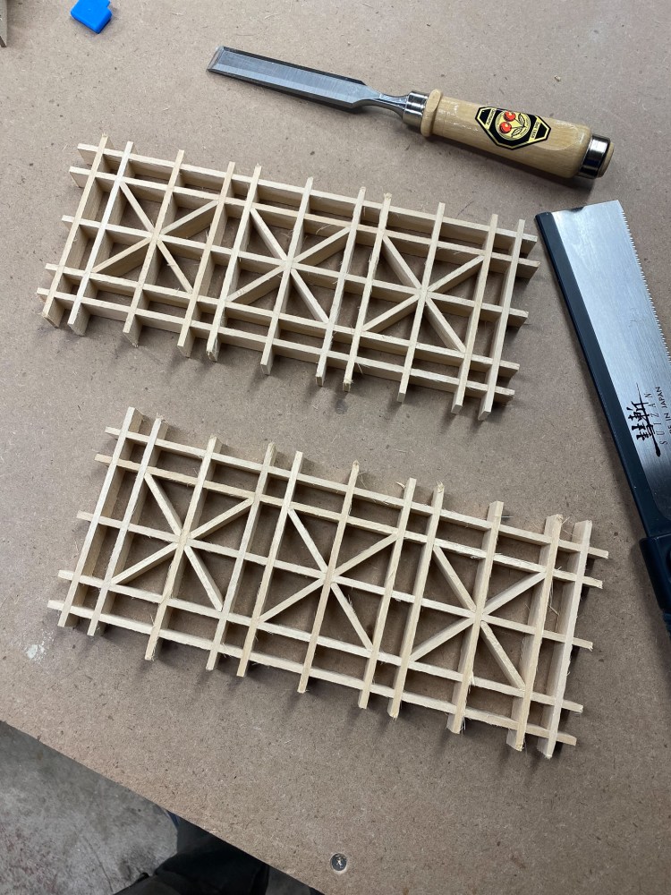 There are 28 little pieces needed to make each of the patterns, and I had six altogether, so about 150 little parts to cut with a chisel, and fit in to place. That’s a lot more than the first one I made, but some I have seen on YouTube have thousands, so I have a long way to go. That said, it was still an undertaking to work out the size for each, to cut them to length with a small Japanese hand saw called a dozuki, and then to cut bevels of different angles on the ends of each piece. Actually, all of the pieces needed two bevels cut on each end. Then you fit them in place with a tiny dab of glue. I would listen to music and just make each piece, one after another. It was almost meditative as before I realized it, an hour, or two, or so would have passed, and I was stiff from standing in nearly the same position that whole time while I worked. I think that is a key part of what I enjoy about the process making a kumiko pattern. That mental state where the world around fades away and my focus is on one simply task at hand. Cutting each bevel so that the piece fits just right. When it does not, cut it again, or make a new piece, and keep plugging away at it. After a while it suddenly dawns on you that the pattern is emerging, that you are making progress. It’s hard to see at the beginning, but a little faith in the process, and a good helping of patience and then it just comes together.