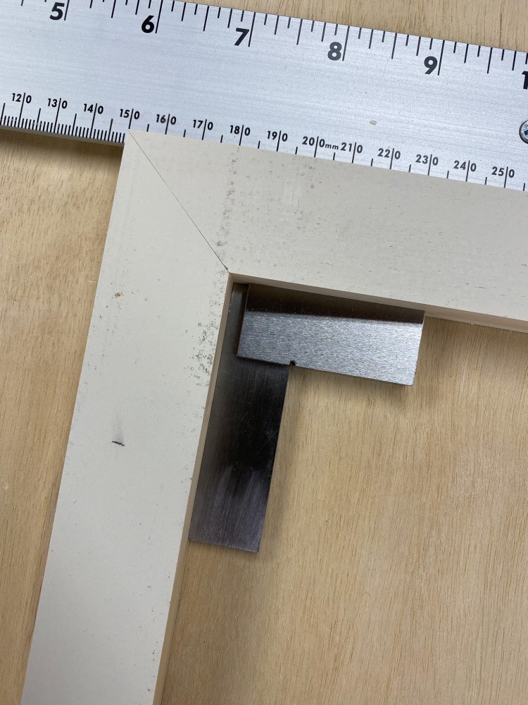 It failed. The miters were off, and the length was not quite right, so the frame simply didn’t come together. You can see the big gaps at the joints, and no amount of clamping was going to bring them together, so once again, I set this project aside, and went to work on other odds and ends, until I set my mind on making a picture frame jig. In this case I followed the instructions in the Michael Alm youtube video https://youtu.be/Mr0p2DLPTts to build a sled, with a 45 degree angle and a movable stop to replicate cuts. Then a few test cuts later, I moved on to trying to make the sapele frames for the kumiko again. This time if was much more successful. Of course having tried it once before helped, and I was able to avoid the mistakes of the first attempt This time I was please with the results and could move on to glue up.
