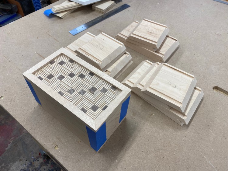 So I returned to the very beginning. New pieces of baltic birch plywood. New zero clearance insert on the saw. I checked and re-checked the angle setting and how I stabilized the board as it went through the cut. Then when it came time for glue up, I was extra careful with setting the angled pieces on the blue tape, and how I folded them together. I checked each with a square as I put the rubber bands on. This time it worked. Well, it worked enough. Some of them still came out a little wonky, but the majority were good, and I could assemble patterns, and just set aside the ones that seemed screwy. In the end I was able to get more pieces out of the wood, based on some changes to how I cut them, and this netted me enough patterned sections to make 4 tops and 4 bottoms, with a handful of leftovers.