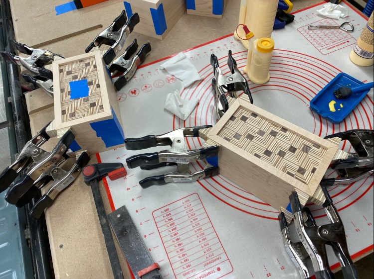 This is typically the most stressful part of a build – once the glue goes on the clock starts ticking, and pieces need to be quickly assembled and into the clamps before the glue sets. I have since learned that Titebond II was probably not the best choice for this, but it is what I typically have on hand. Maybe next time I will go with something that sets a bit more slowly. To help lower the stress, I used I trick I saw on Bourbon Moth Woodworking (https://youtu.be/ilyZkKBWGQY) where he attached some small mitered blocks to the corners using CA glue and then used them to get a nice square surface for the clamps. I tested it out first on some small maple off cuts, and it worked out, so I made a bunch of them and started my glue ups. It was stressful, as they always are, but in the end the boxes came together, and stayed square. I was a bit frustrated as I think some of the joints looked better when I dry fit them, than how they came out in the end, after applying glue. I think maybe the glue started to set before I got all the clamps in place. Then I let them sit overnight.