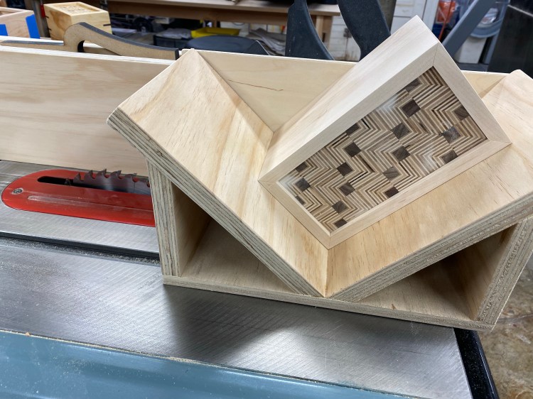 Turns out those other projects did not go as planned and I didn’t really get started on this for some time. Eventually the stars aligned and I decided to give it a try – but having had some table saw challenges on my other projects, and having never worked with baltic birch plywood before, my initial plan was to make a prototype. Turns out I had so many little squares of patterned plywood, that I made two prototypes. I posted about it back in November (https://sawdusting.com/2021/11/11/building-a-prototype/). I considered it a successful prototype – but there were areas I needed to improve. It needed to be a bit wider, I wanted the accent wood in the plywood pattern to be larger, I wanted to get rid of the “bunny ears” on the spline joints and finally, the boxes needed to have more accurate 90 degree corners as the prototype lid on one of the boxes only fit in one direction since the box was out of square. Good that I had a practice run, but there were certainly things to fix this time around.