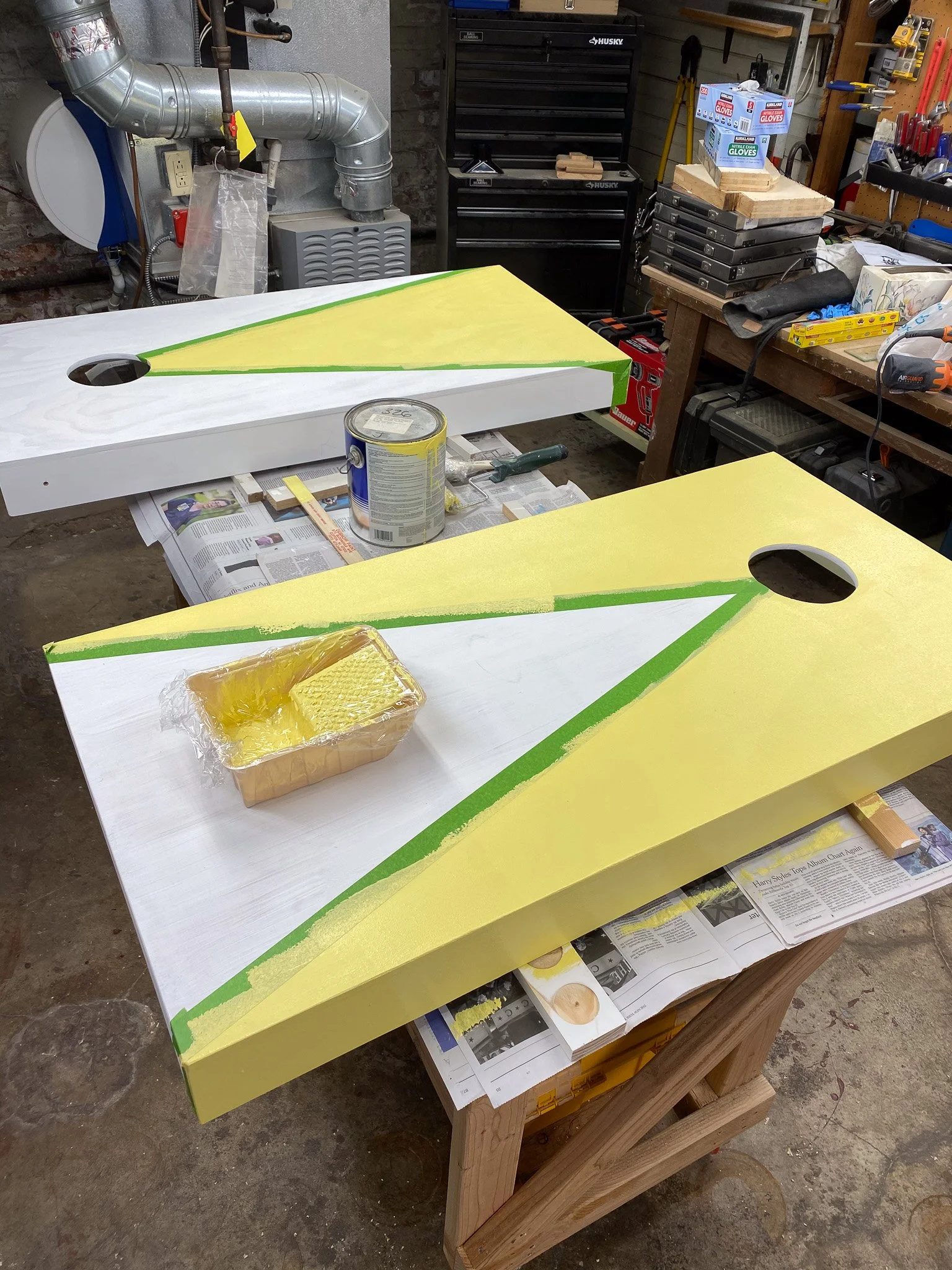 We made the legs from the same FJ pine, adjusting the length to get the proper height for the back end of the boards. Then it was time for paint. A two-tone paint scheme was agreed upon and after much discussion (and the only choices of paint already in the house) a combination of light purple and soft yellow won out. I ordered the actual bags online, I was not prepared to start sewing them up myself. After the paint dried, they got a sprayed-on coat of clear finish and then it was time to play.