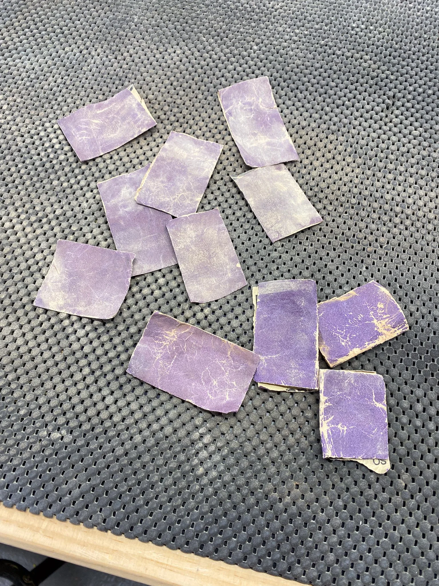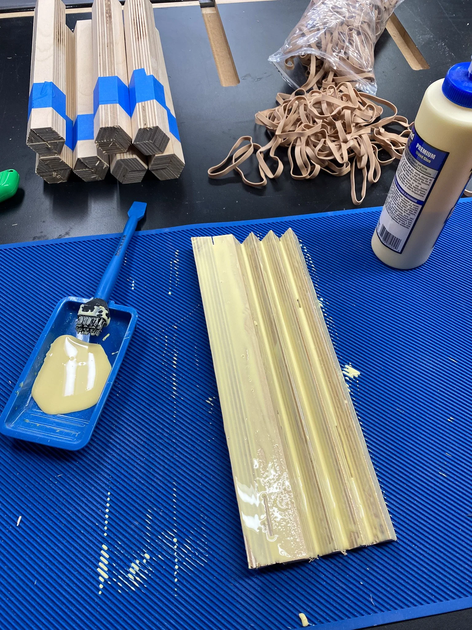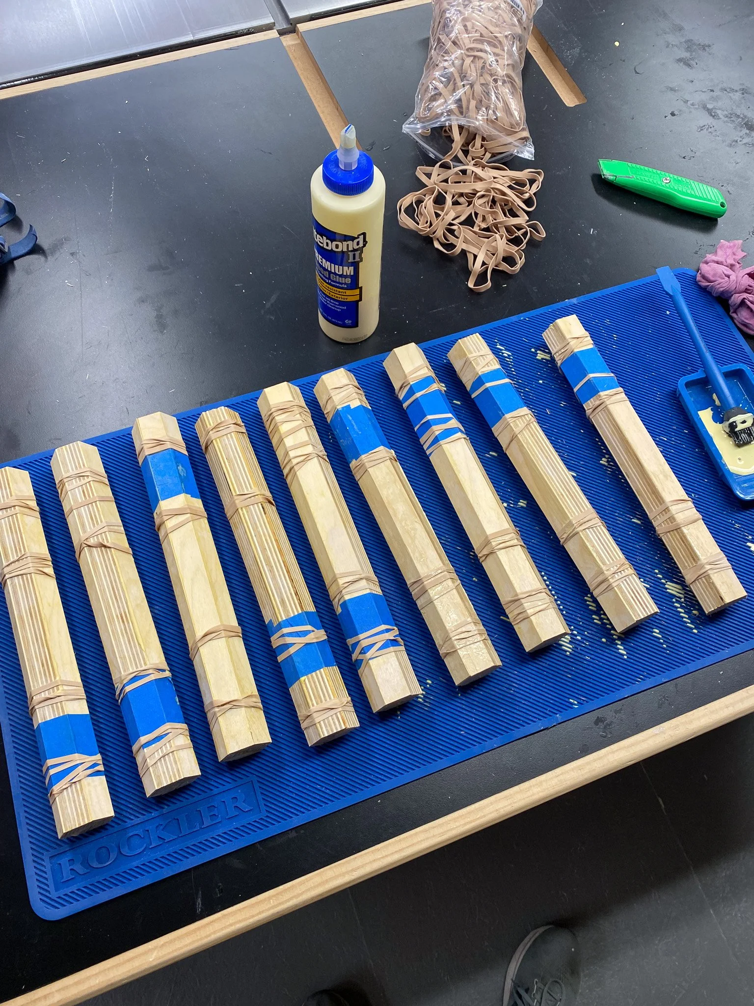 First up was making strips in the shape of trapezoids and triangles. Some patterns were just three trapezoids, others mixed triangles and trapezoids. Once the strips were cut (I had no rhyme or reason, just tried to cut a bunch of each), it was time to settle on the patterns and glue them in to “logs”. I tried to find a mix of patterns (I made 6 different patterns) and to use the wood in a way that left the least over. Each log was glued together and wrapped with rubber bands to serve as clamps until the glue set up.