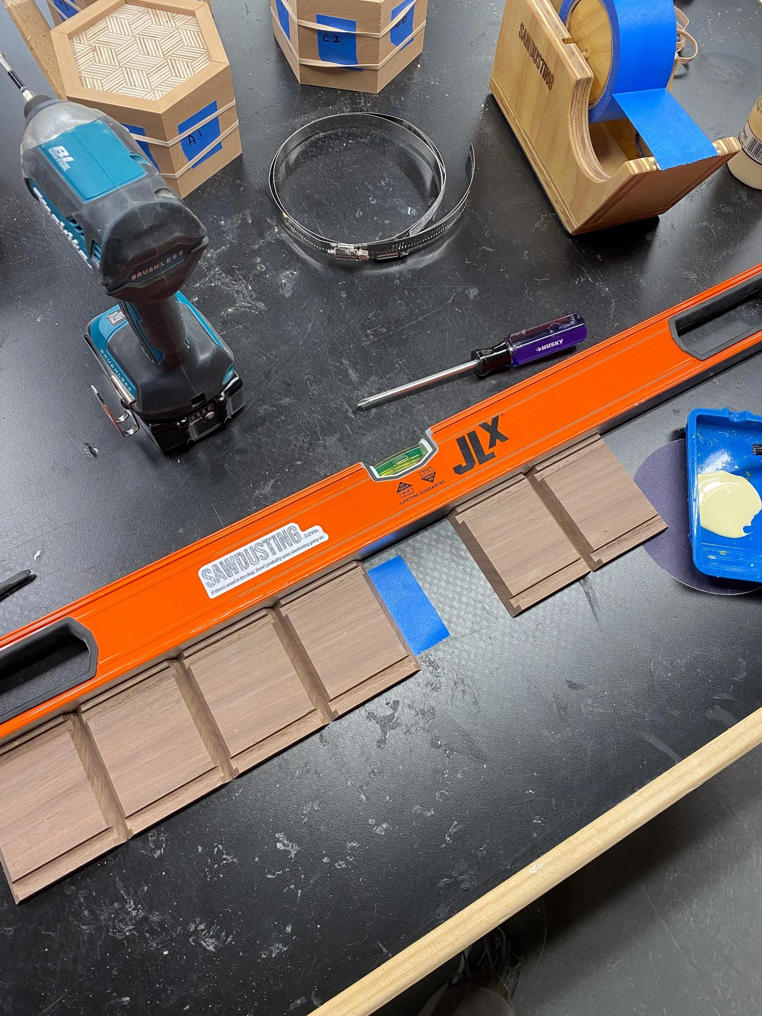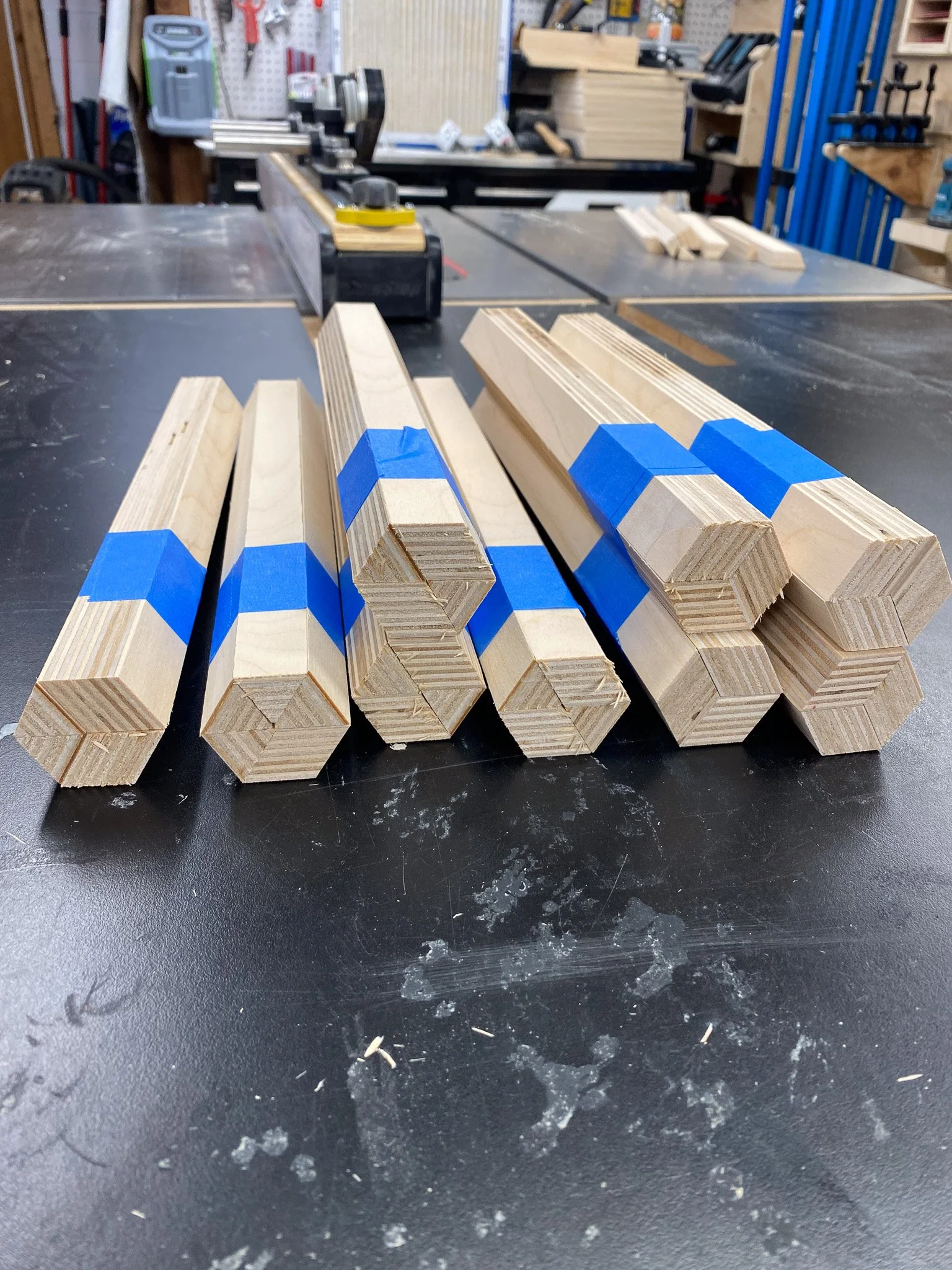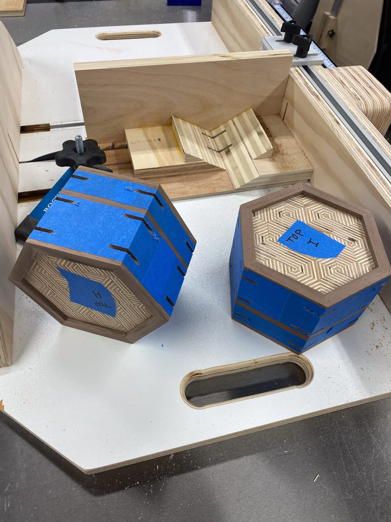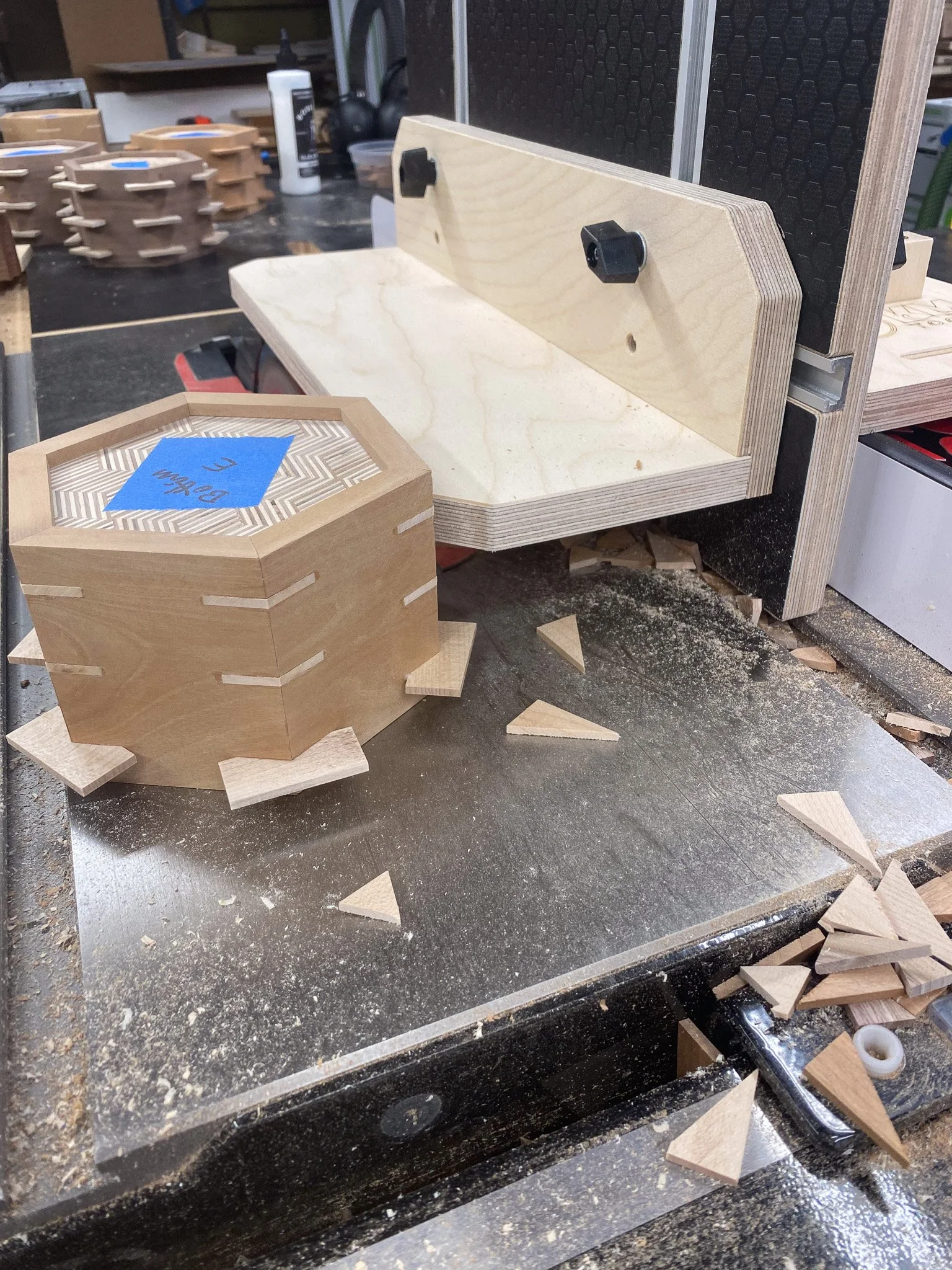 Then I could line up all the pieces against a straight edge, and tape them all together with blue tape. That kept them together so I could apply glue, fit in the top and bottom plywood pieces, and roll it up in to a hexagon. I used the hose clamps again to apply even pressure and waited for the glue to dry. This took some time as I did not have enough clamps to glue them all at once - so glue, wait, and then repeat. In the end, I think the hose clamp approach worked out OK and I was pleased with the joints. By hand I cleaned up any glue squeeze out on the outside and now I had boxes. To make them stronger and add some visual interest to the outside, I wanted to add splines. These are made by cutting a groove where the boards meet at the point of the angle, and then fitting a piece of wood in the groove and gluing it in place. This addition of a wood strip in a different orientation will significantly increase the strength of the joint - and to some, they look nice.