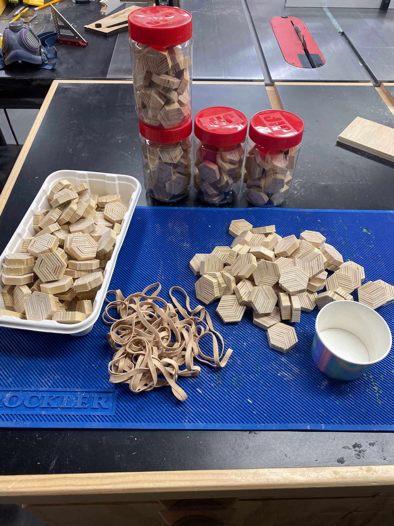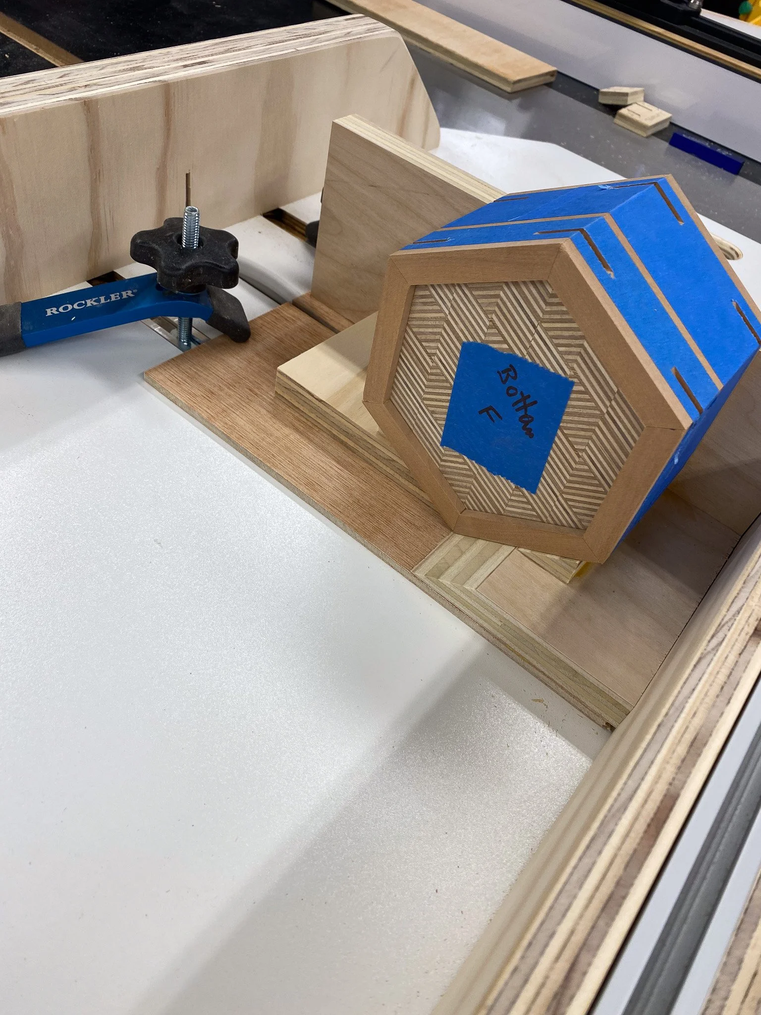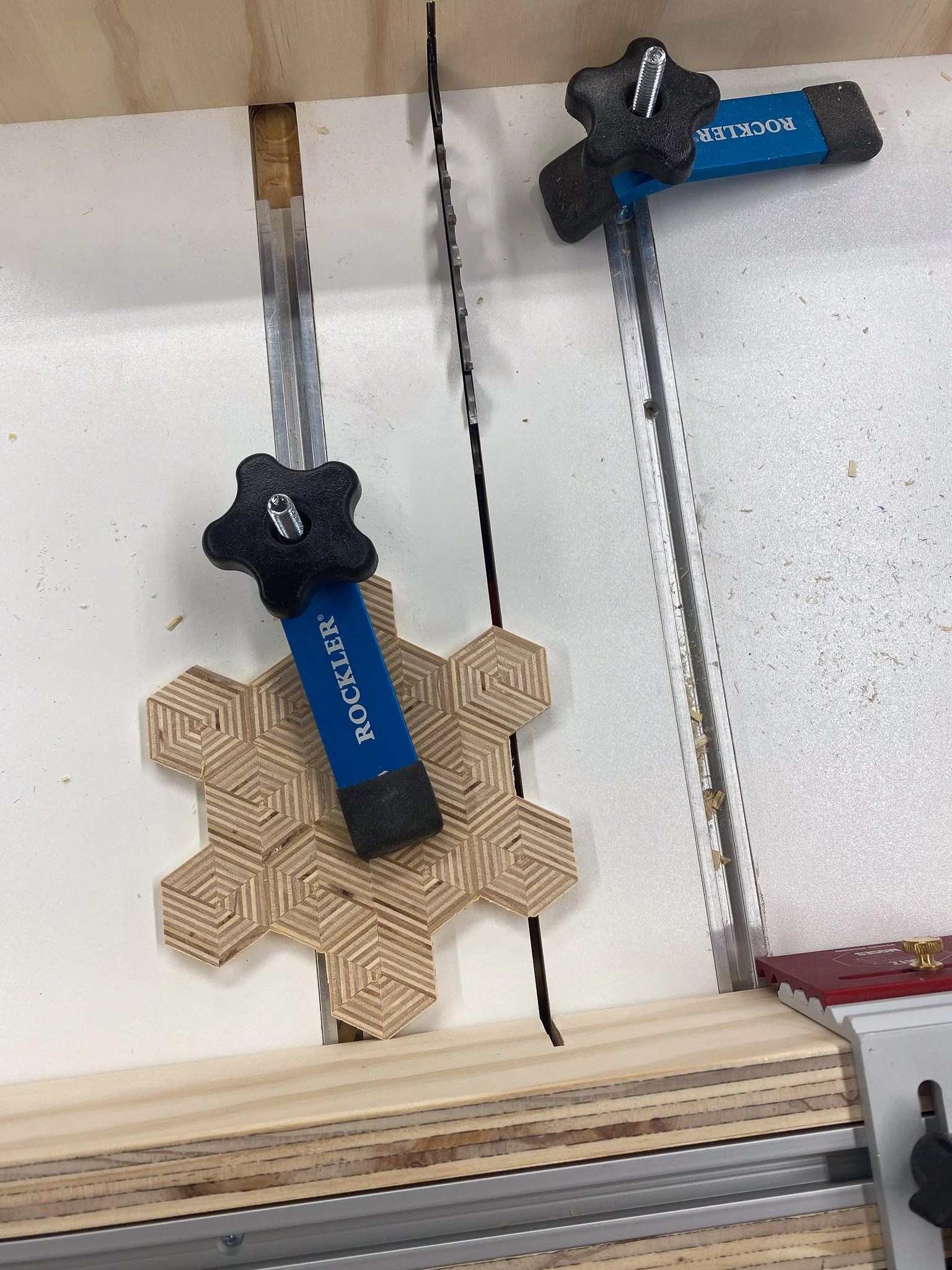 Once all the cookies were cut, and assembled in to the bigger patterns, I glued them up and used hose clamps to keep them tight until the glue set. It was during this phase that the uneven nature of the bandsaw cuts became apparent as the surfaces were not flat. I could sand them smooth, but was worried if I did it with my random orbit sander, that they would be uneven. The best solution was to drive to my parent’s house and use my Dad’s drum sander. A whole bunch of passes for the 18 pieces (9 tops and 9 bottoms) and while they were a bit thinner than I planned, they were level and smooth. The final step was to take the snowflake shaped cookies and trim them down to a proper hexagonal shape, which I did on my table saw with a crosscut sled. That completed the patterned plywood part of the project.