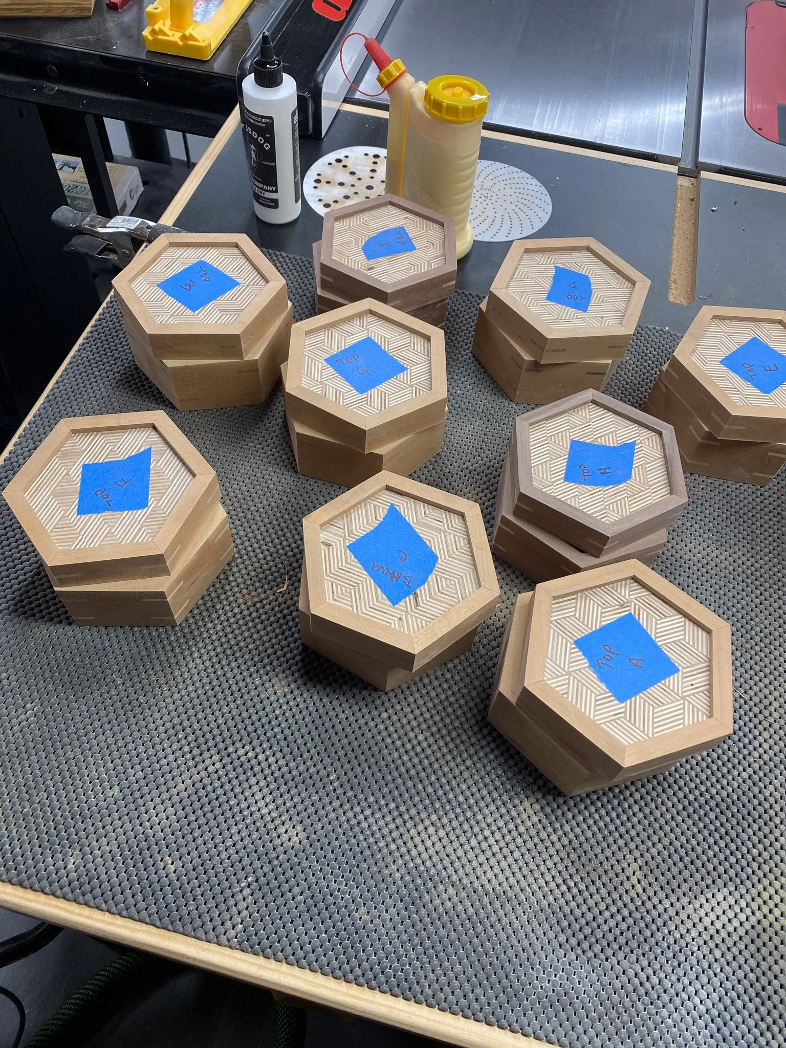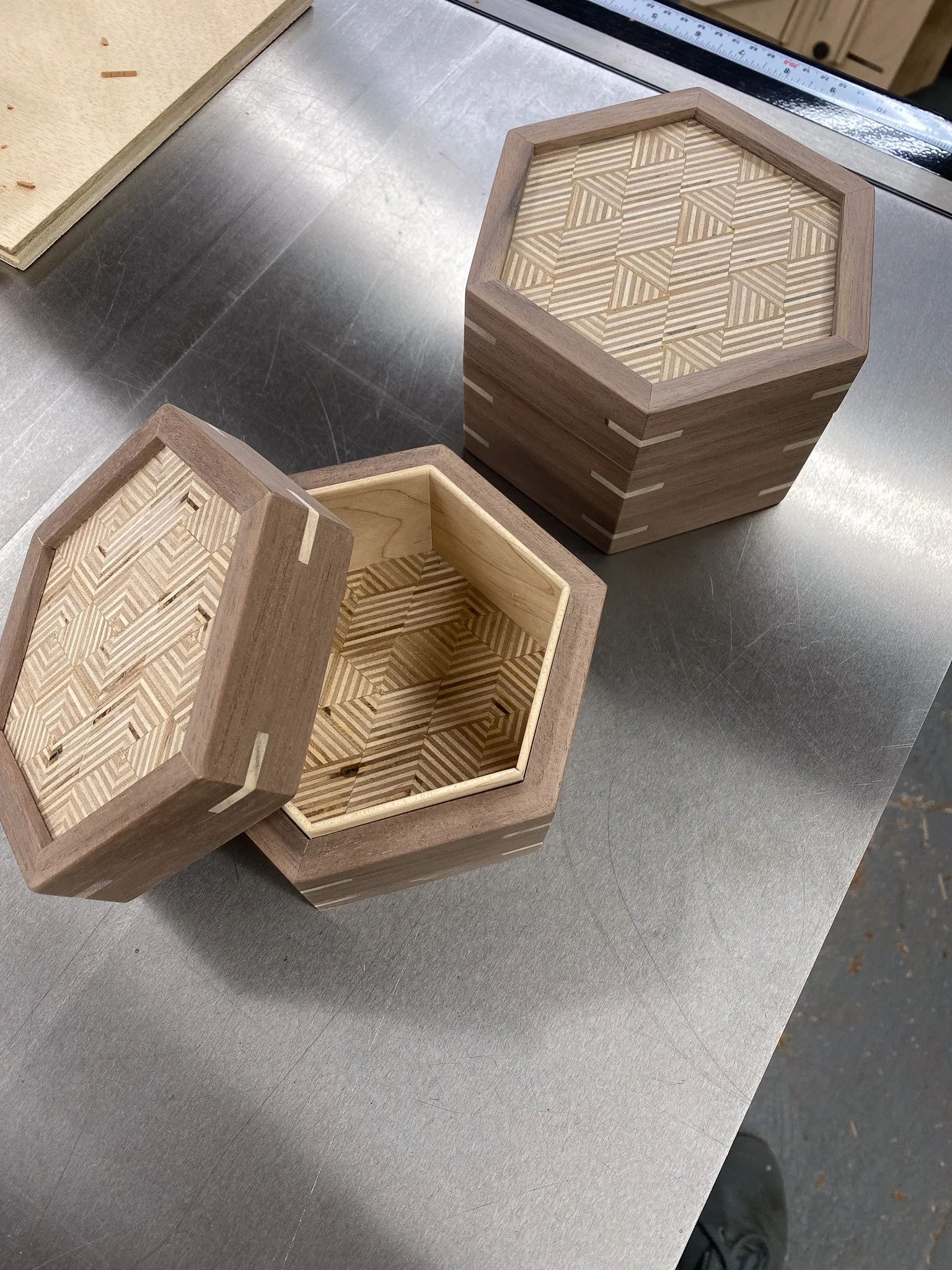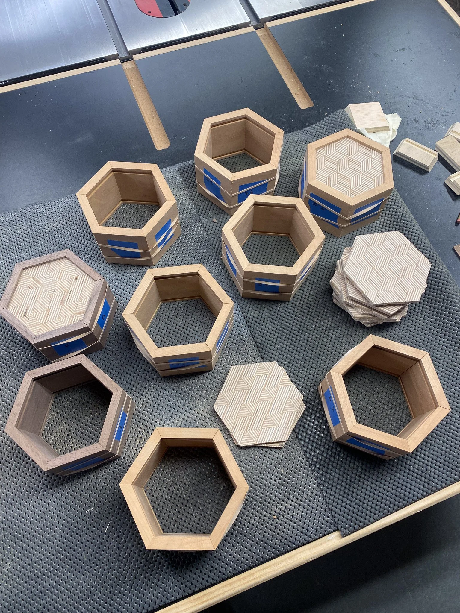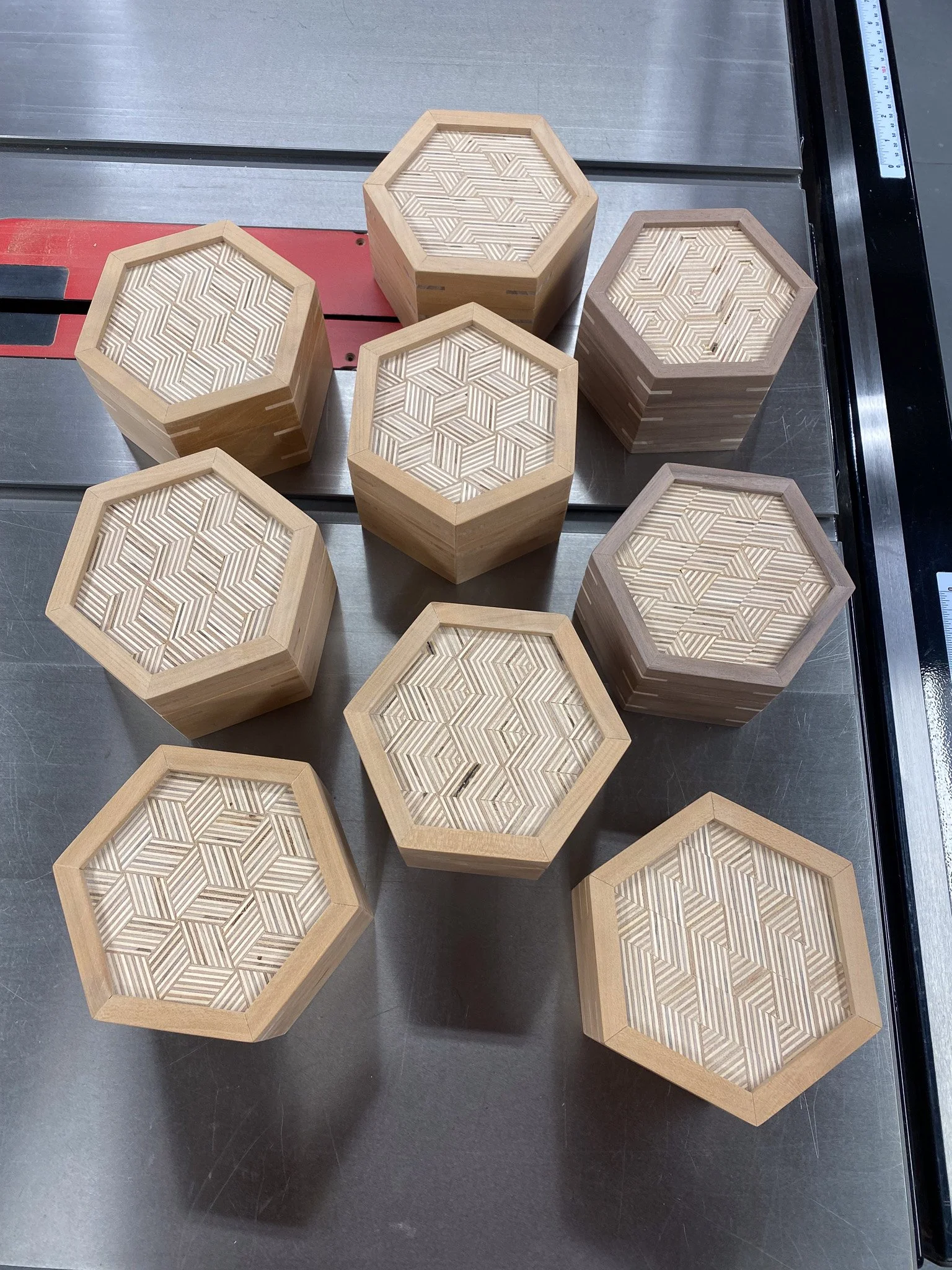 It was time to make the cut to separate the top from the bottom. This time I could rest the flat side of the box on the table saw, and so no jigs were needed. Just set the spacing for the fence, and the height for the blade and go for it. Worried that the lid would wobble in to the spinning blade once released, I instead cut a groove on each of the 6 sides that was ever so slightly shallower than the thickness of the wood - thus keeping the top attached. Then a few quick passes with a Japanese pull saw, and the lid was free. After another round of sanding, the boxes all had tops and bottoms, but nothing to seat the lid on, to register them in place. This is where the liner comes in. Essentially I made some very thin strips of wood that were a bit taller than the inside of the bottom of the box - so they would stick out a bit. Then they all got cut to make a hexagon, and were fitted in to each box to line the sides on the bottom. Since the wood sticks up a bit, the lid can seat on that edge, and stay in the right spot, rather than simply sliding off. There’s no hinges, the lid lifts all the way off. I used cherry, maple and some mahogany scraps to make all of those pieces.