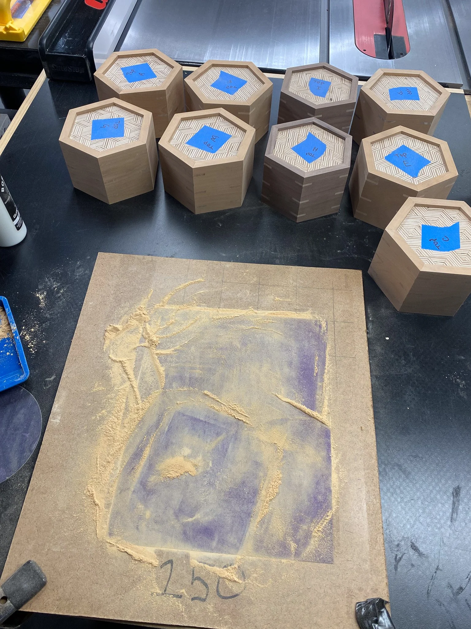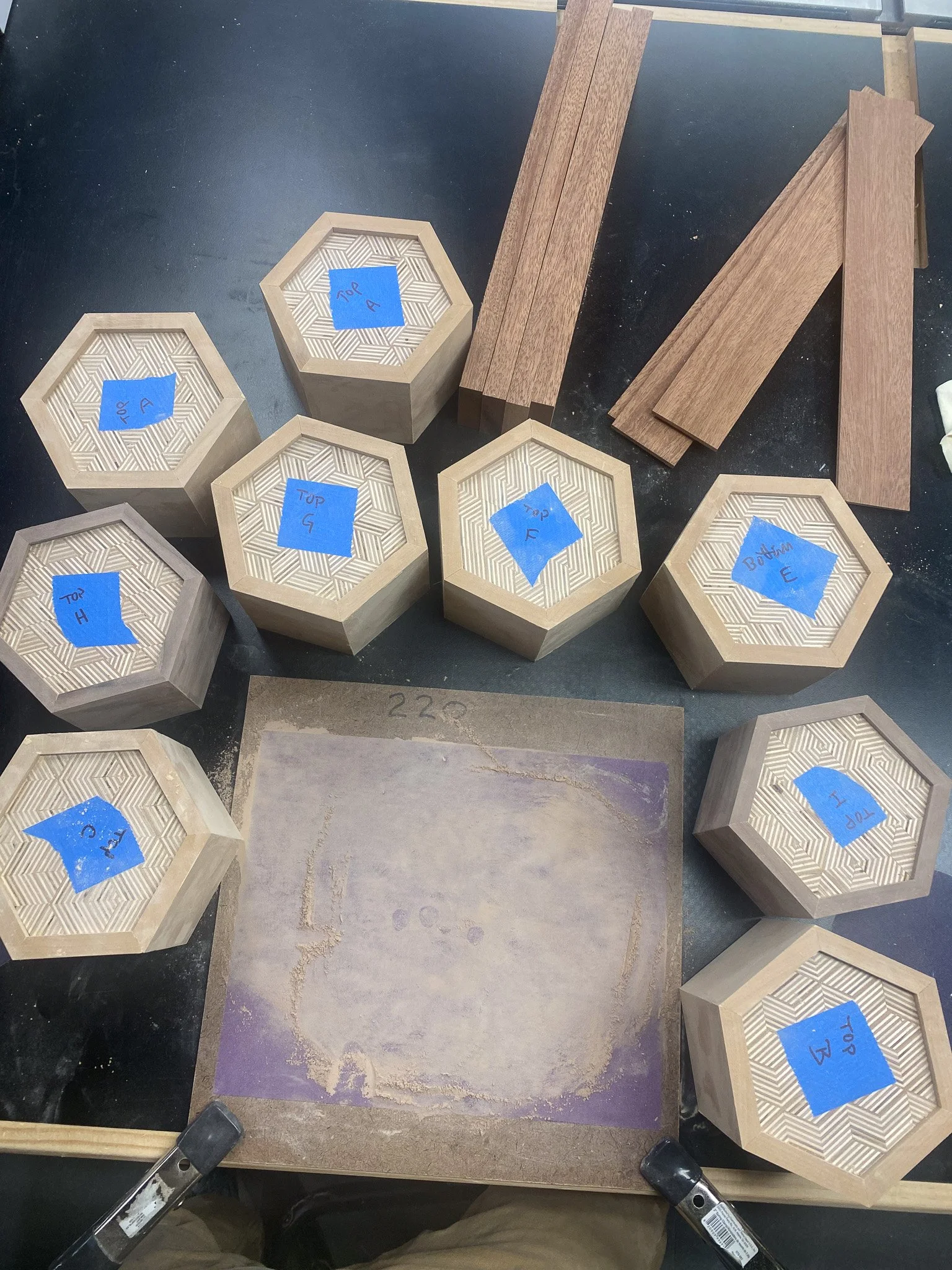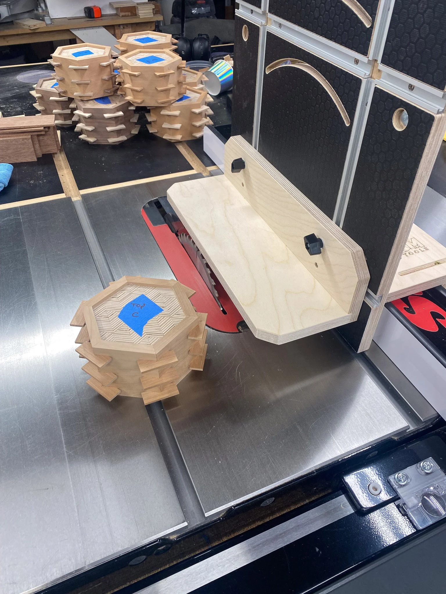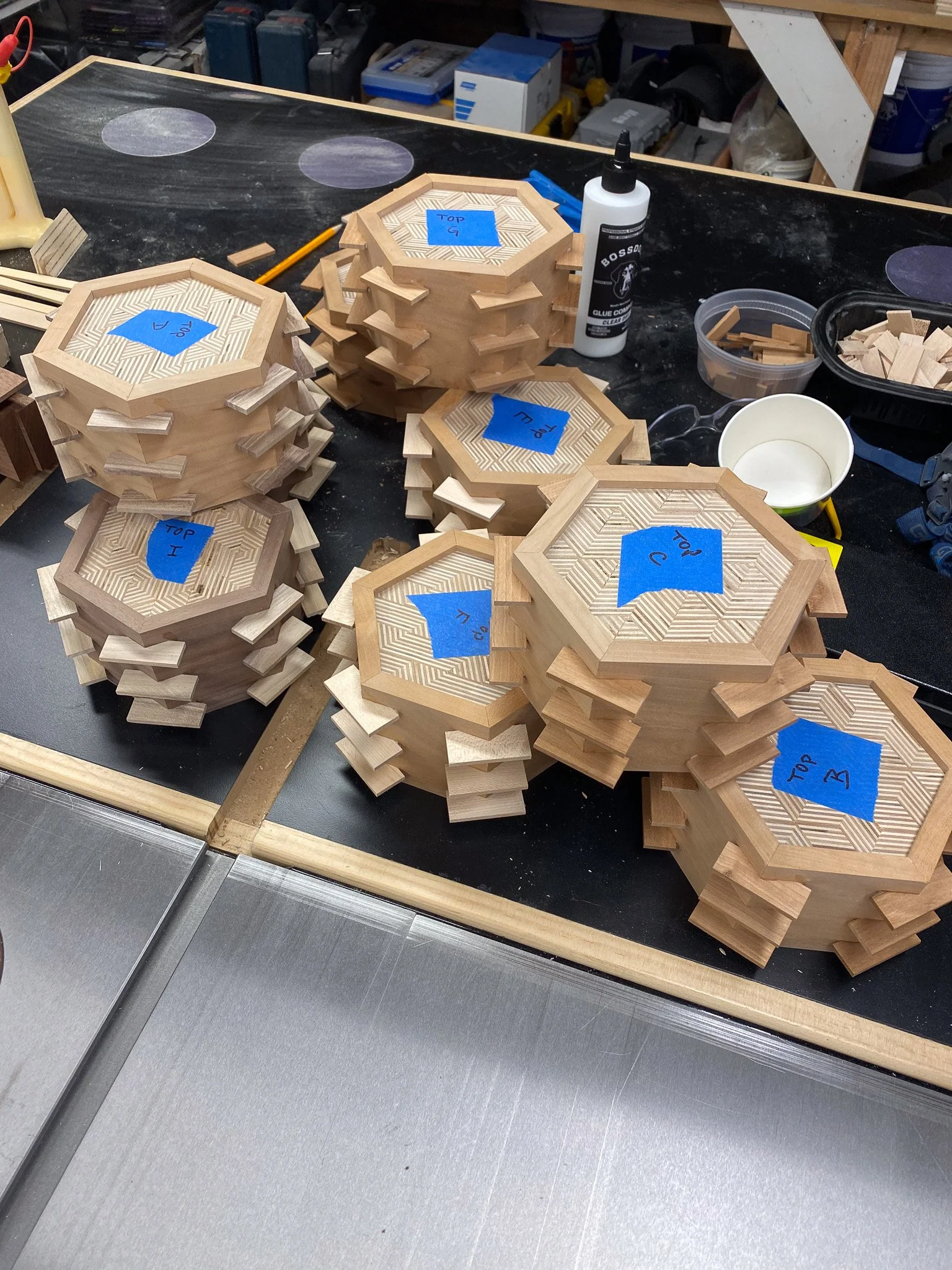 It was time to make the cut to separate the top from the bottom. This time I could rest the flat side of the box on the table saw, and so no jigs were needed. Just set the spacing for the fence, and the height for the blade and go for it. Worried that the lid would wobble in to the spinning blade once released, I instead cut a groove on each of the 6 sides that was ever so slightly shallower than the thickness of the wood - thus keeping the top attached. Then a few quick passes with a Japanese pull saw, and the lid was free. After another round of sanding, the boxes all had tops and bottoms, but nothing to seat the lid on, to register them in place. This is where the liner comes in. Essentially I made some very thin strips of wood that were a bit taller than the inside of the bottom of the box - so they would stick out a bit. Then they all got cut to make a hexagon, and were fitted in to each box to line the sides on the bottom. Since the wood sticks up a bit, the lid can seat on that edge, and stay in the right spot, rather than simply sliding off. There’s no hinges, the lid lifts all the way off. I used cherry, maple and some mahogany scraps to make all of those pieces.