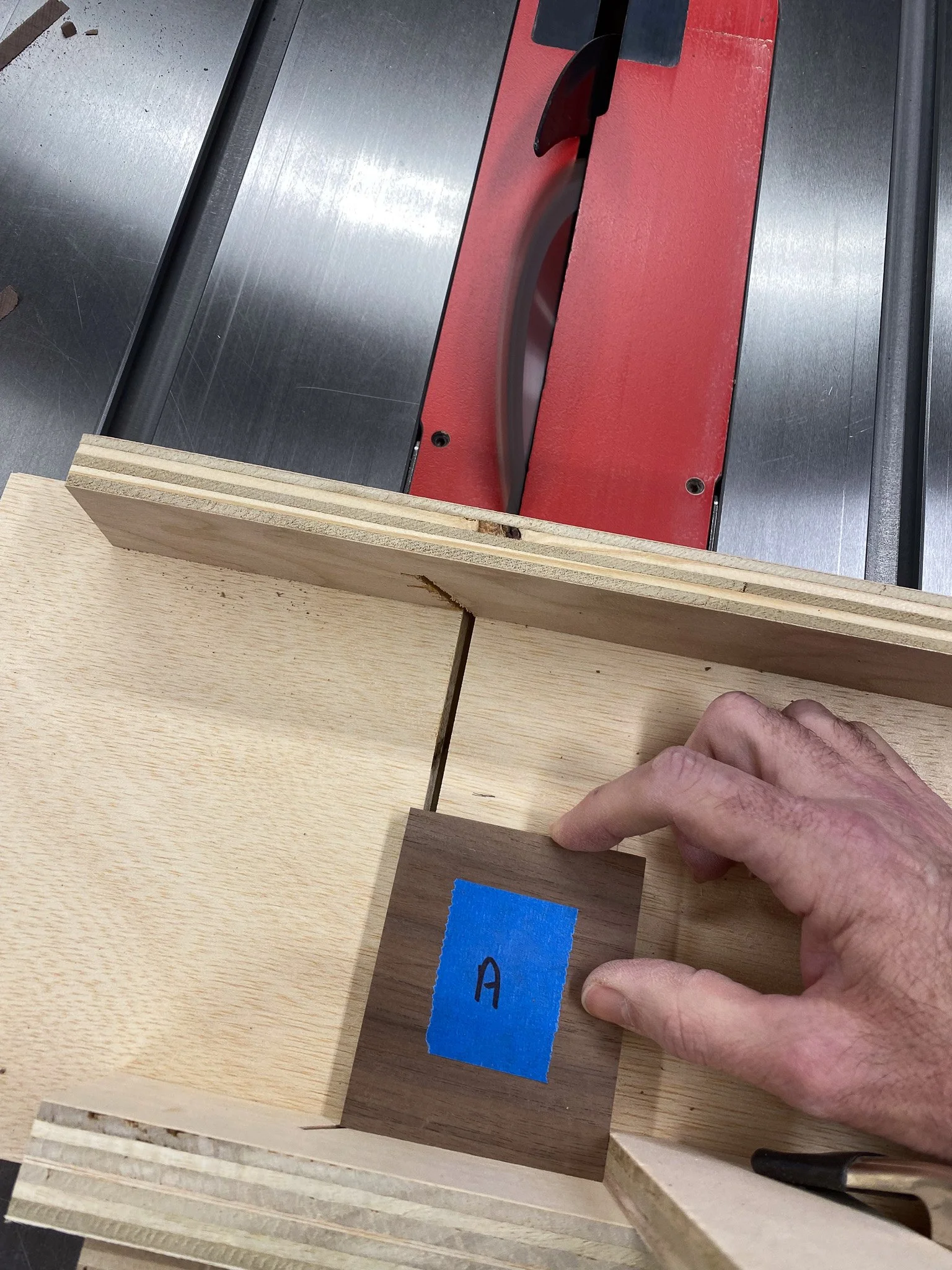 Once assembled, a few quick cuts and then I could build my jig for splines. Some more scraps and superglue later, and I was ready. Over and over I checked my math to be sure the splines would be evenly spaced after the lid was separated from the bottom and then I made my first cut - and quickly realized it was wrong. After checking and rechecking, I had set the box down one way and picked it back up differently and made the cut on the wrong side. Ooops. I finished all the cuts on each of the 9 boxes with no more issues, and I have shown the boxes to a number of folks and so far, no one has picked out which one had the issue, so I think I wriggled out of that one - but I can find it. These things happen. Next was deciding what wood to use for the actual splines. I decided to mix that up as well. For the walnut boxes I used walnut splines, but the sapwood, which is much lighter in color, rather than the normal brown heartwood everyone thinks of when they think walnut. I used cherry splines on some of the cherry boxes, and for others I used maple to enhance the contrast. I glued in all the splines, there were 162 of them (3 per joint, 6 joints per hexagonal box, and there were 9 boxes). Normally I cut them off by hand - but that requires a cut on each side of the spline, or over 300 cuts. Ugh. Then I remembered that watching a video about the fancy jig I just got, that Jason Hibbs of Bourbon Moth Woodworking, made a small box with splines, and he used the L fence to cut them off. Seemed like a great opportunity to try that out.