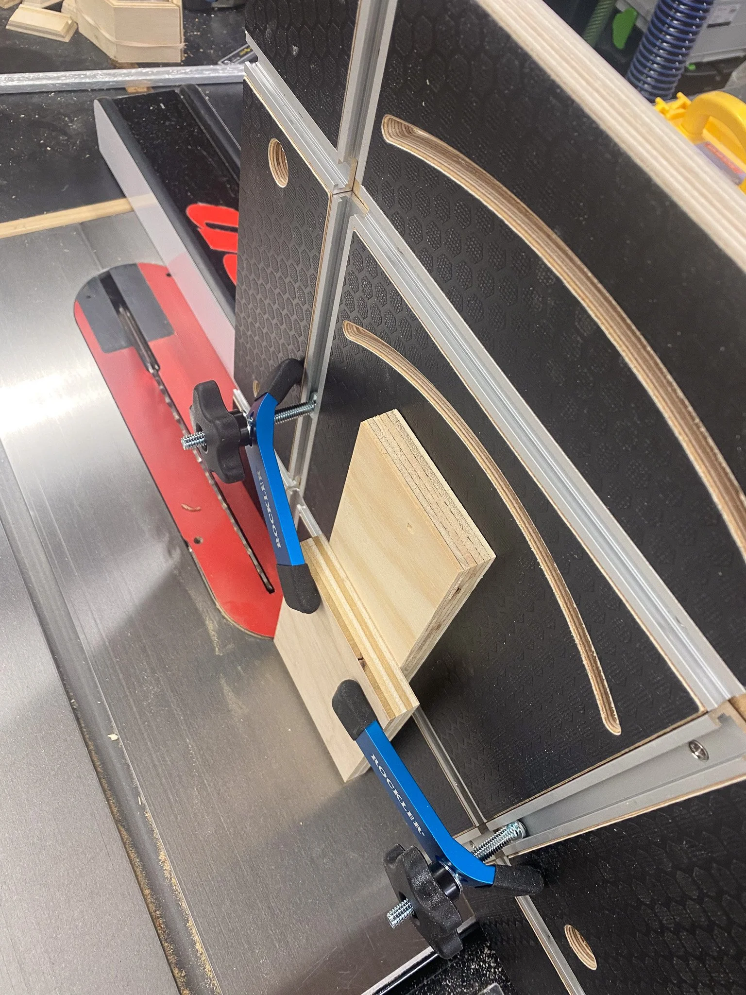 To accurately cut the grooves for the splines I needed to make a jig to hold the boxes as I passed them over the blade of the table saw. The groove goes through the point of the joint along the side of the box, and not the flat face, so it is hard to balance the box on the point and slide it through the saw. The jig would need the complementary angles to allow the box to sit in position as it passed over the blade. This made my brain hurt as I tried to remember my high school geometry and eventually I realized that the angle I needed was too steep for the saw - as it won’t tilt that far. The solution is to hold the board vertically over the blade, rather than laying flat on the table like usual, and then you can cut those really steep angles - but that also requires a jig to do safely. Luckily I had just taken delivery of the Katz Moses/Bourbon Moth Universal Jig that I had ordered months earlier on pre order (nifty jig). It would be perfect for this cut - and led to a side project of putting that together.