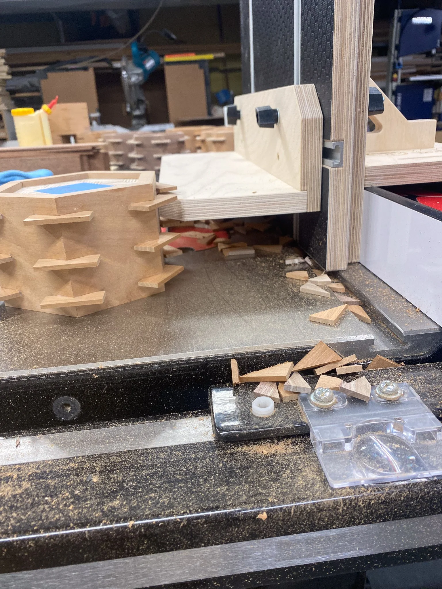 Bascially the L fence sticks out from the vertical panel of the jig and goes over the blade of the table saw. The idea is to line that up perfectly to the edge of the blade and then run the box along the L fence. That allows the box to ever so slightly miss the blade, but the splines sticking out get cut off. I was nervous about this, but after pondering for a bit, I just went for it. Turned out, it worked great! I made a pile of little offcuts, but in hardly any time, I had them all cut off and ready for some sanding. It was so much faster than doing it by hand with a flush trim saw. So much faster. Then I could sand the outside flat faces, and get ready for the nest step.