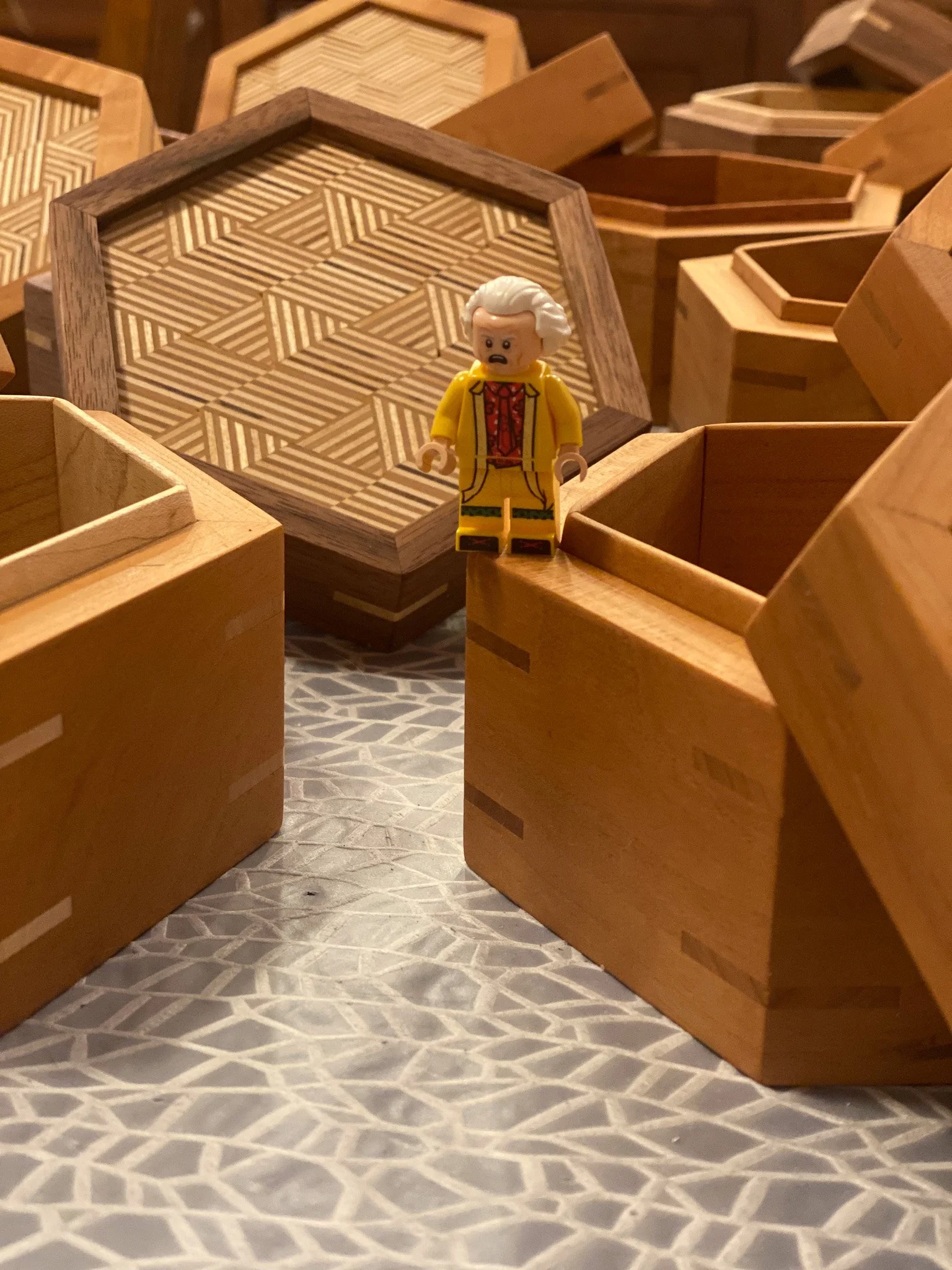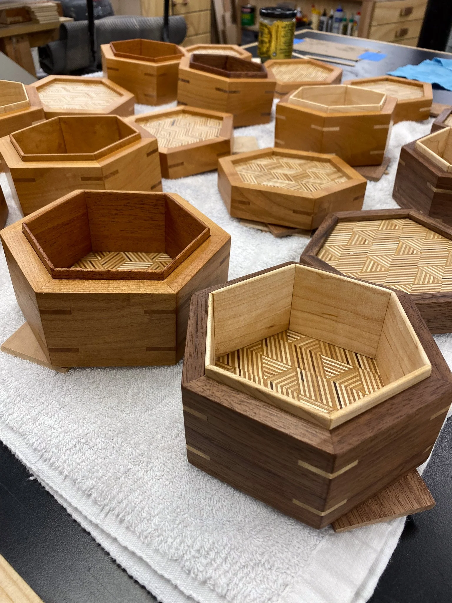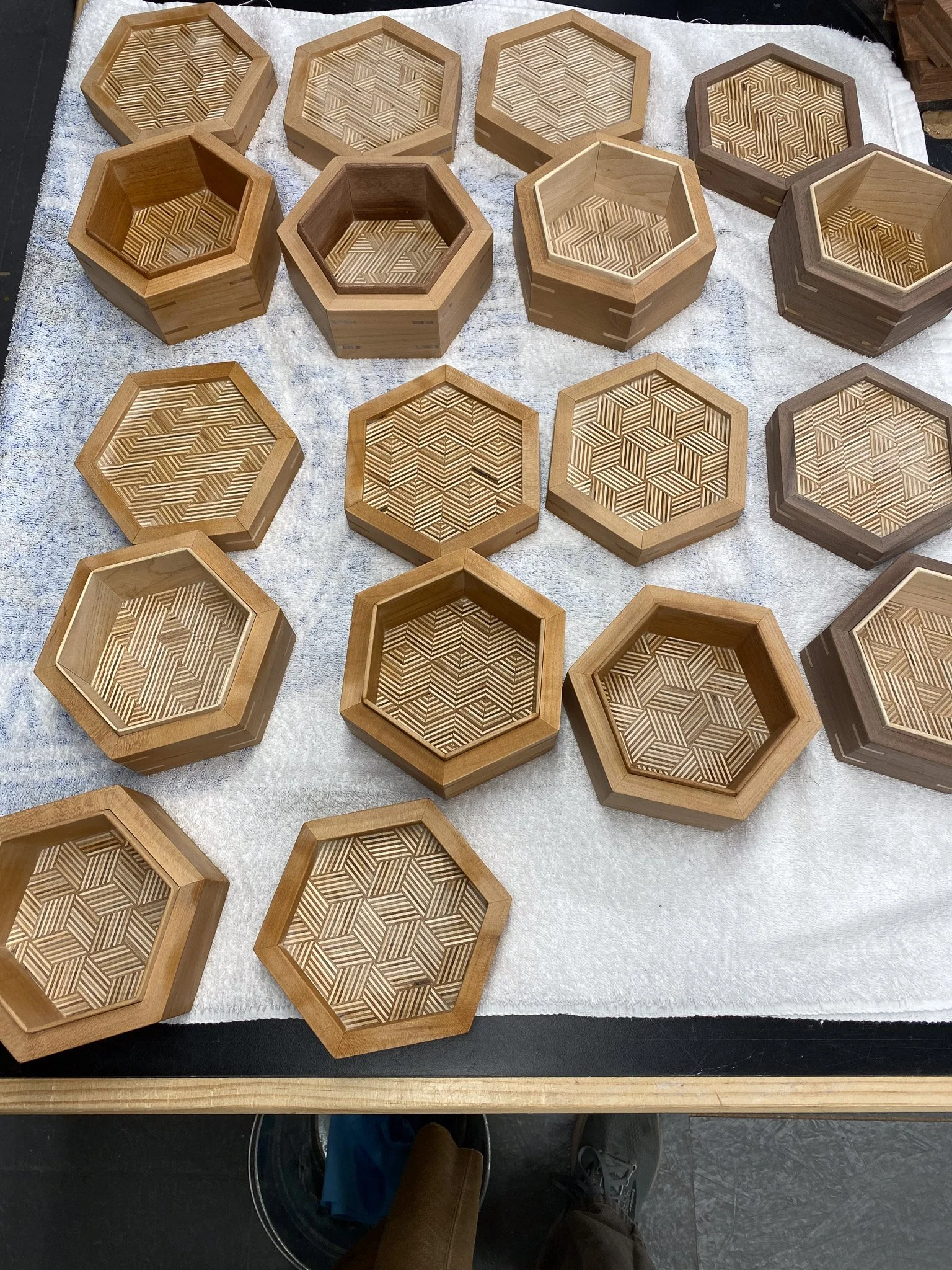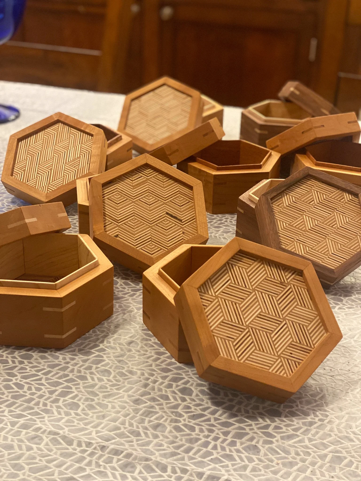 At this point, the boxes were complete and just needed a bunch more sanding to get ready for finish. Softening all the sharp edges, making everything nice and smooth and tweaking the fit of the box lids. That was quite a bit of hand sanding as I worked up through the grits. At last, the homestretch. I went with a hard wax oil finish inside and out. It is easy enough to apply - rub it all on with a scotch brite pad, and let it sit a bit, and then buff it off. Maybe easy, but very time consuming to make sure no extra finish is left, that it gets in all the nooks and crannies, and gets buffed evenly. I did three boxes at a time and eventually completed them all. Last up was taking some pictures and then I could call this project a wrap. For sure I will be revisiting patterned plywood to try more patterns, and to make more projects with it.