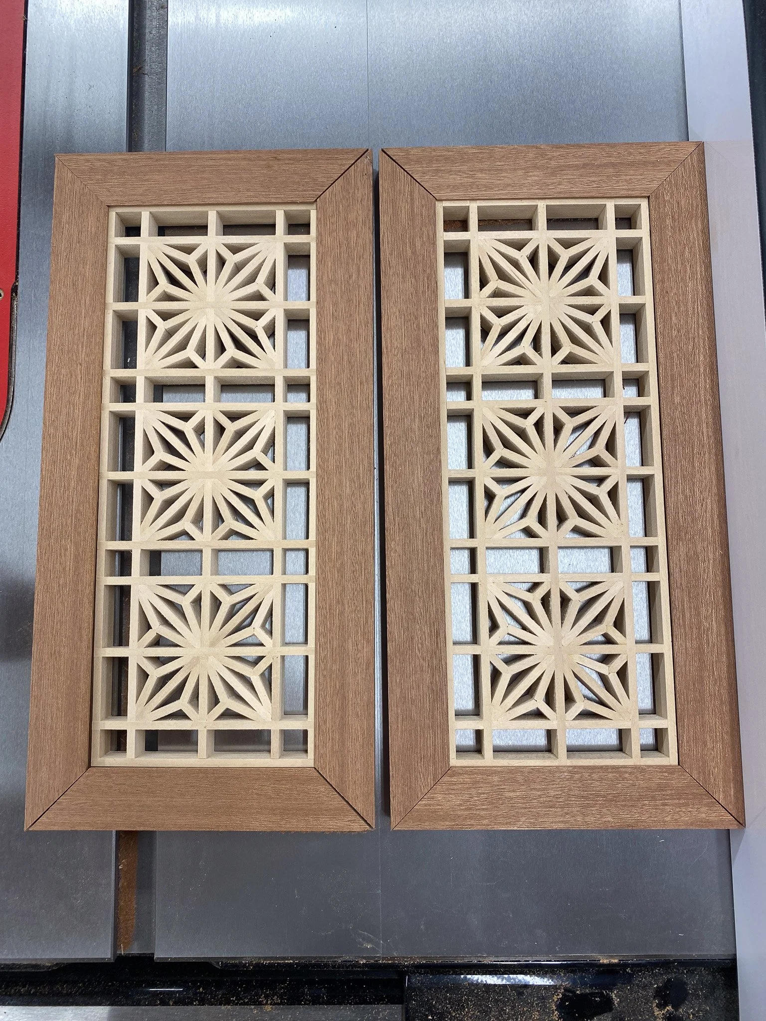 Having no outfeed table anymore - the old one was the wrong height, and the miter slots no longer lined up - I decided to have a quick go at making some frames out of sapele, for the kumiko project that I had made. This was a quirky build as the frames needed to be viewed from both sides - different than a normal picture frame that has a back side where you insert the picture. This one had to be assembled around the kumiko, since there was no way to insert it after glue up. To complicate things, I wanted the overlap of the frame on the edge of the kumiko to be ever so small so as to visually keep it looking the same dimensions as the rest of the kumiko elements. That meant a recess (a dado) of about 1/16th of an inch. SawStop to the rescue. I was able to get the depth I needed and keep the cuts straight so that the tiny edge that holds it in on both sides, would stay nice and even.